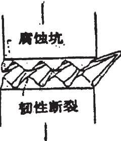 隙道腐燭模型認(rèn)為,在平面排列的位錯(cuò)露頭處,或者新形成的滑移臺(tái)階處,處于髙 應(yīng)變狀態(tài)的金屬原子發(fā)生擇優(yōu)腐蝕。腐蝕沿著位錯(cuò)線向縱深發(fā)展,形成遂洞。當(dāng)應(yīng)力作 用存在時(shí),遂洞之間的金屬產(chǎn)生機(jī)械撕裂。當(dāng)機(jī)械斯裂停止后,又重新開(kāi)始隨道腐蝕, 最終導(dǎo)致了裂紋的不斷擴(kuò)展,至金屬斷裂。如圖1.4所示。